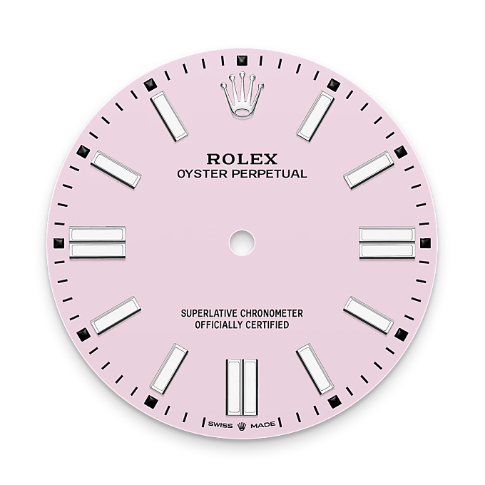 I colori creati per la gamma Oyster Perpetual esistono inizialmente sotto forma di lacca, che deve essere applicata con cura e in modo omogeneo per ottenere una superficie uniforme. L’operazione avviene in una camera ad ambiente controllato per evitare che polvere e impurità si depositino sulla superficie. Sei strati di lacca sono depositati, uno dopo l’altro, sul disco di ottone che è la base del quadrante. Poi si applica una vernice prima di passare alla lucidatura che conferisce al colore tutta la sua brillantezza e la sua vivacità. Successivamente, si procede alla stampa a tampone delle diverse iscrizioni, mentre gli indici e la corona sono rivettati a mano. Il quadrante, scintillante e impeccabile, è pronto per essere montato sul movimento in fase di assemblaggio dell’orologio.