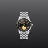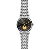 Quadrante nero, finitura satinata soleil, con numeri applicati e indicatore delle fasi lunari
