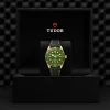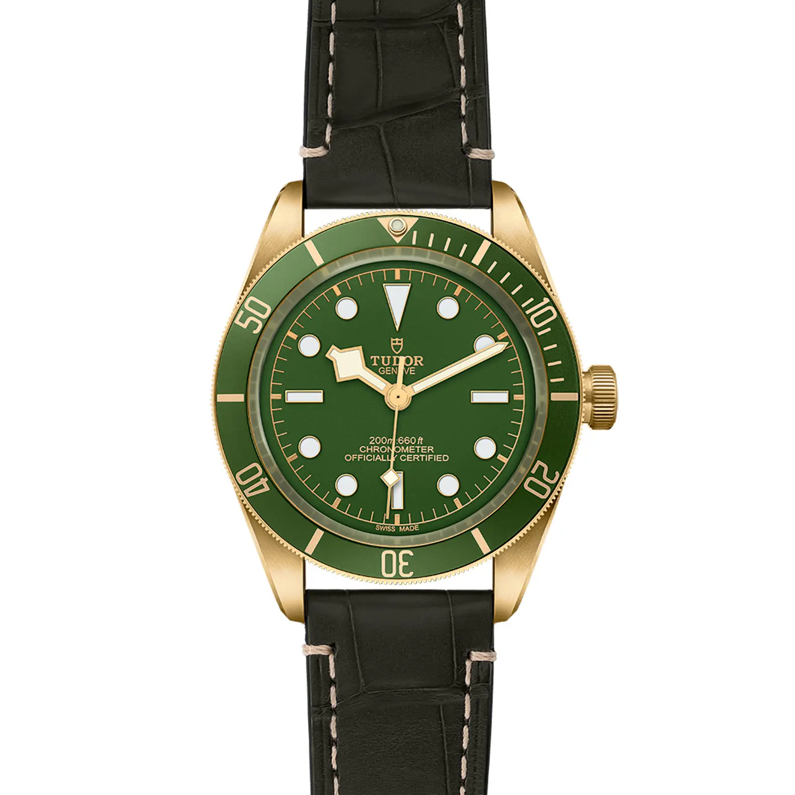 Lunetta girevole unidirezionale in oro giallo 18 ct. con disco graduato 60 minuti in alluminio anodizzato verde opaco e indici e numeri in oro
