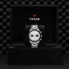 Corona di carica a vite in acciaio con la rosa TUDOR in rilievo Pulsanti a vite in acciaio a ore 2 e 4.
