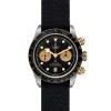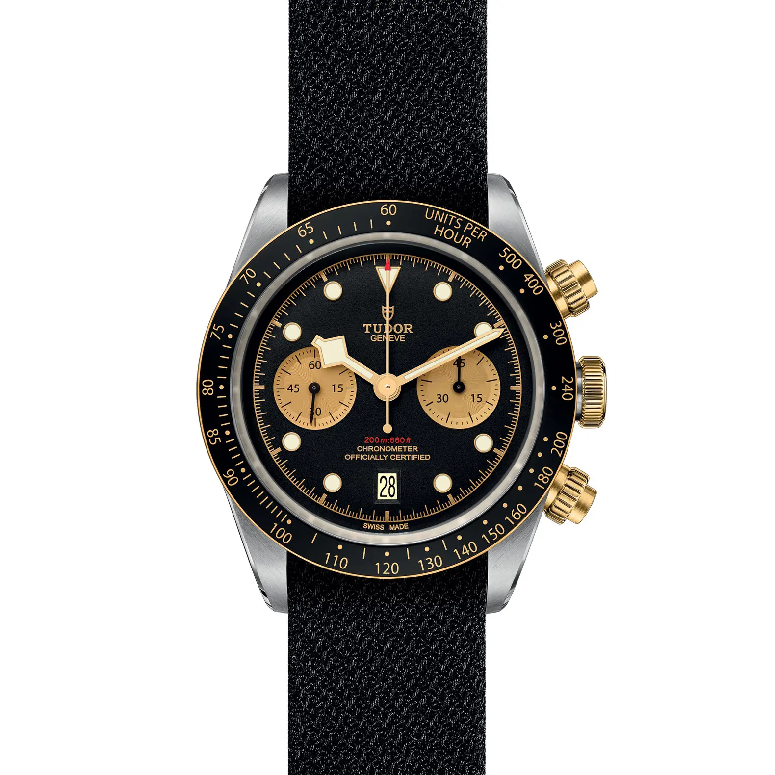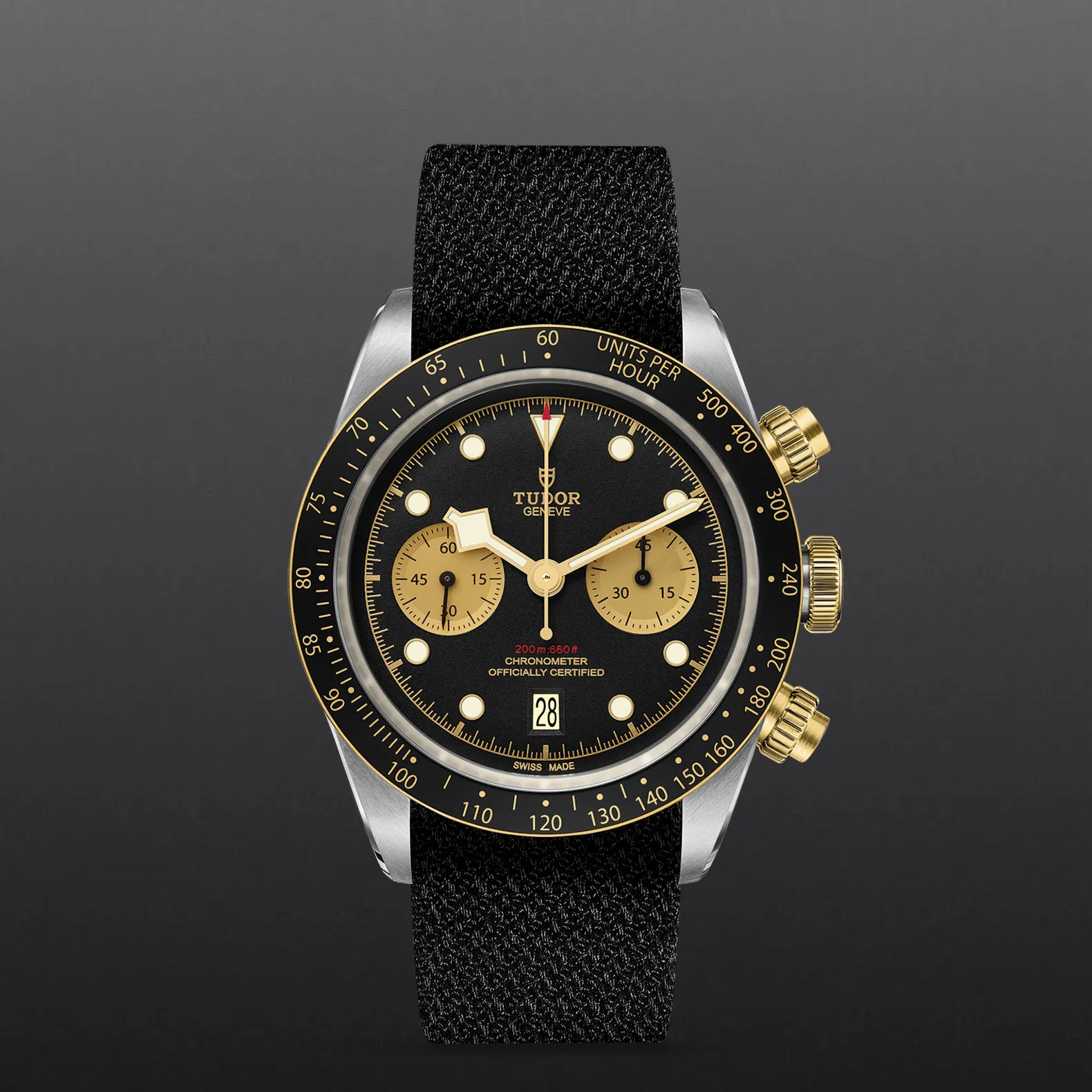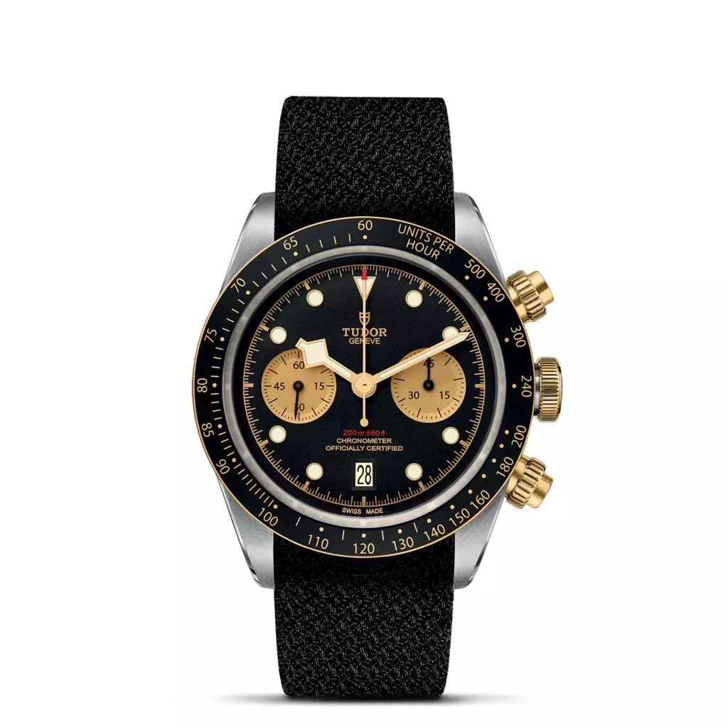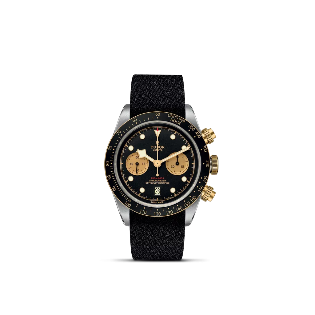 Corona di carica a vite con la rosa TUDOR in rilievo. Pulsanti a vite in oro giallo a ore 2 e 4. Acciaio rivestito da uno strato di oro giallo 18 ct. di 0,3 mm