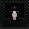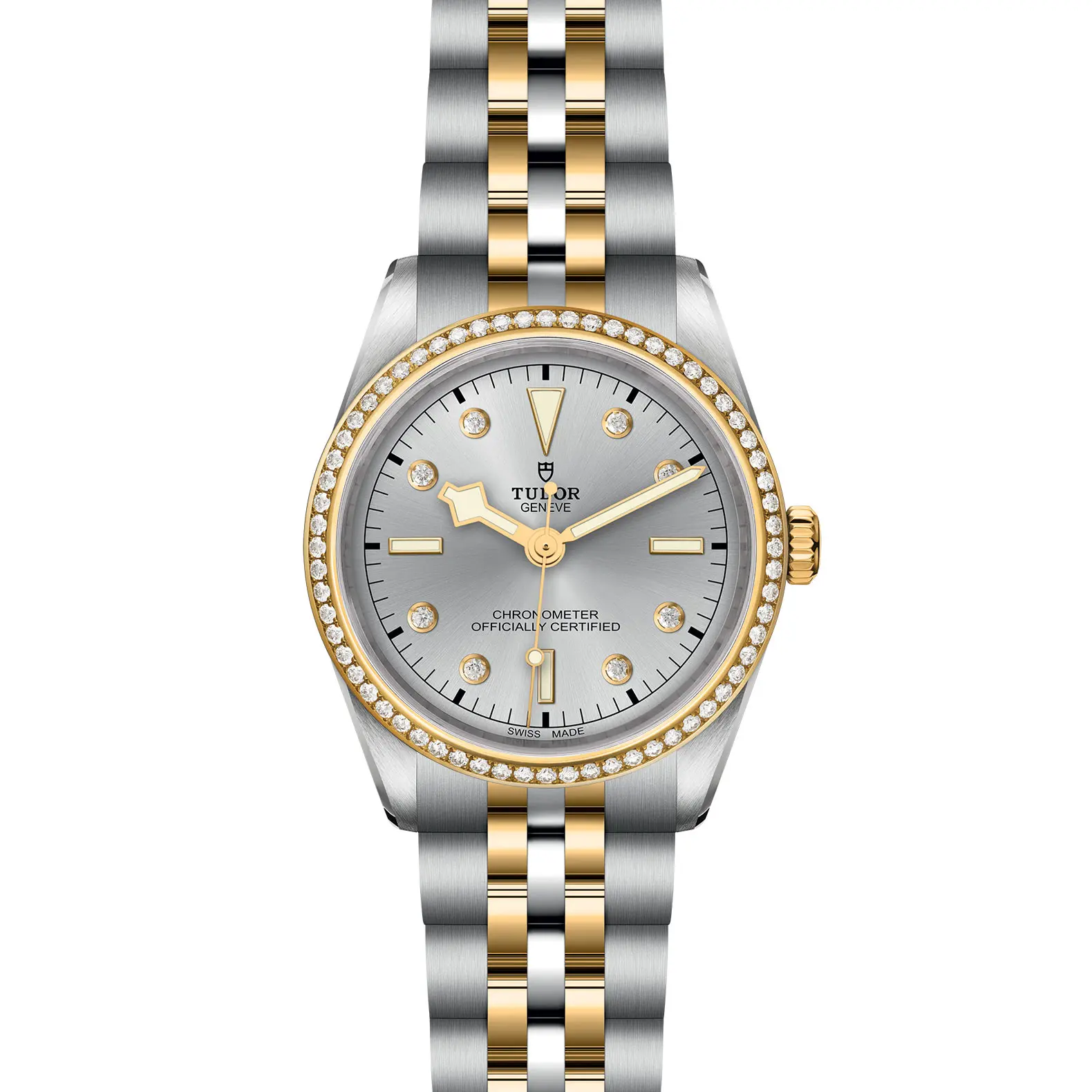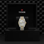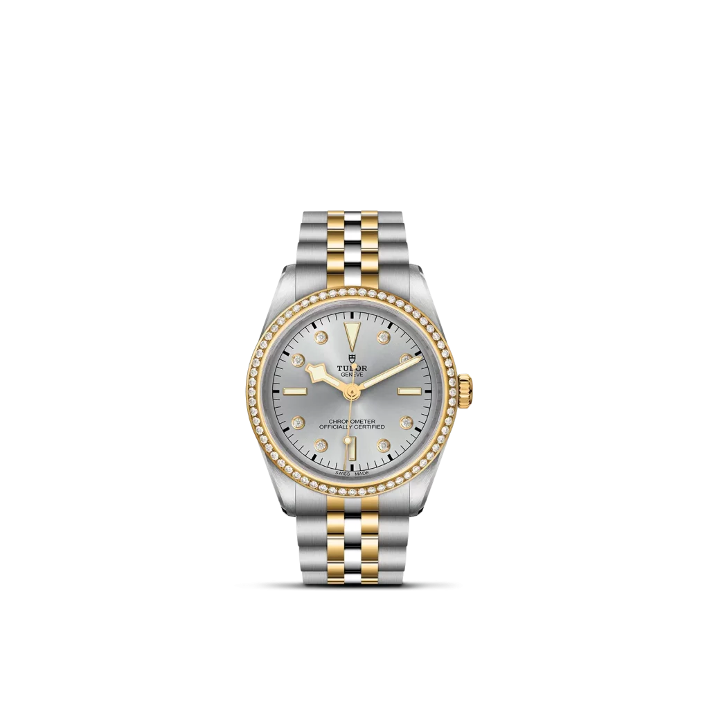 Prime maglie centrali in acciaio o in oro giallo massiccio. Maglie centrali restanti in acciaio o acciaio rivestito da uno strato di oro giallo di 0,2 mm. Chiusura pieghevole TUDOR “T‑fit” con fermaglio di sicurezza. Il logo sul fermaglio è realizzato in oro giallo massiccio