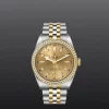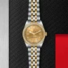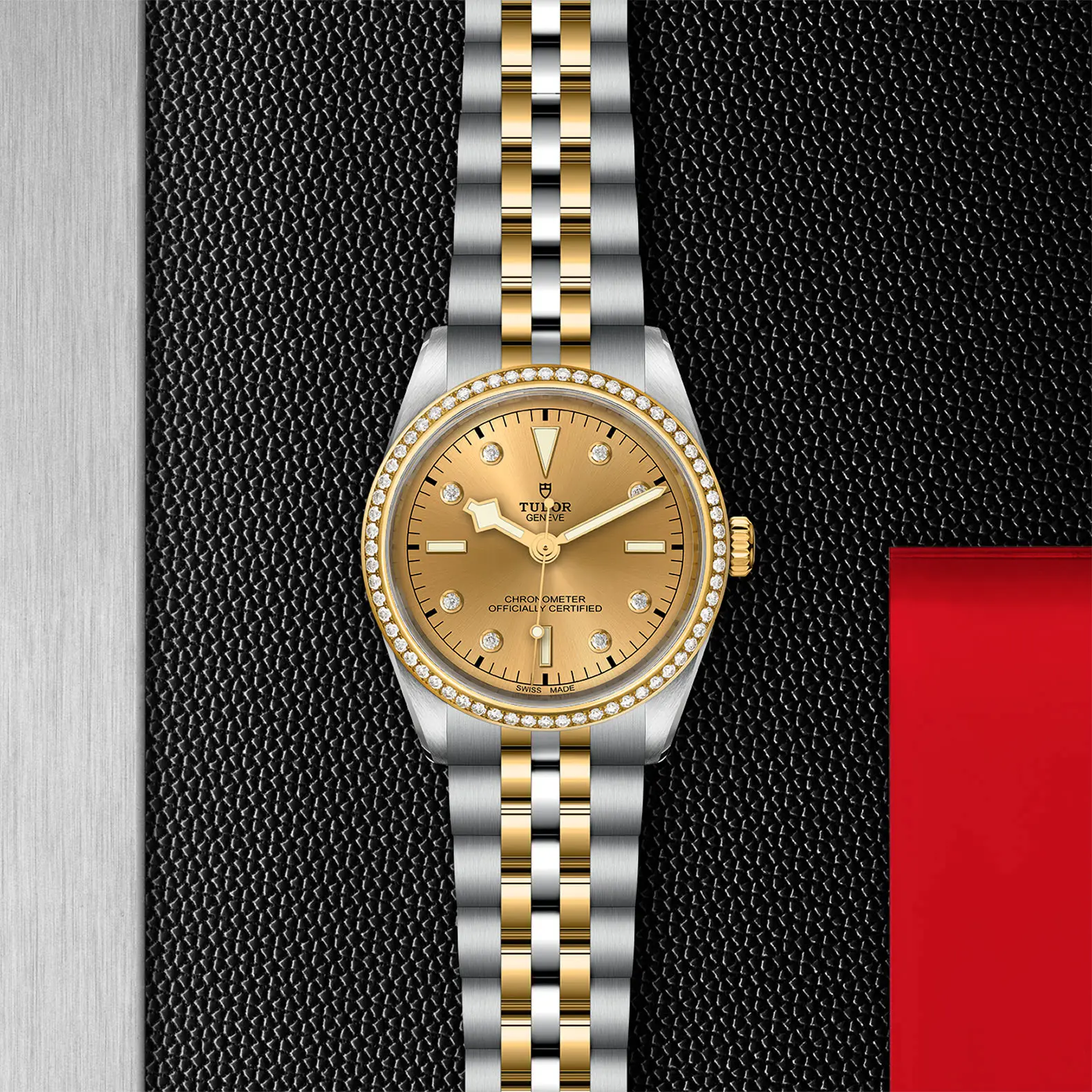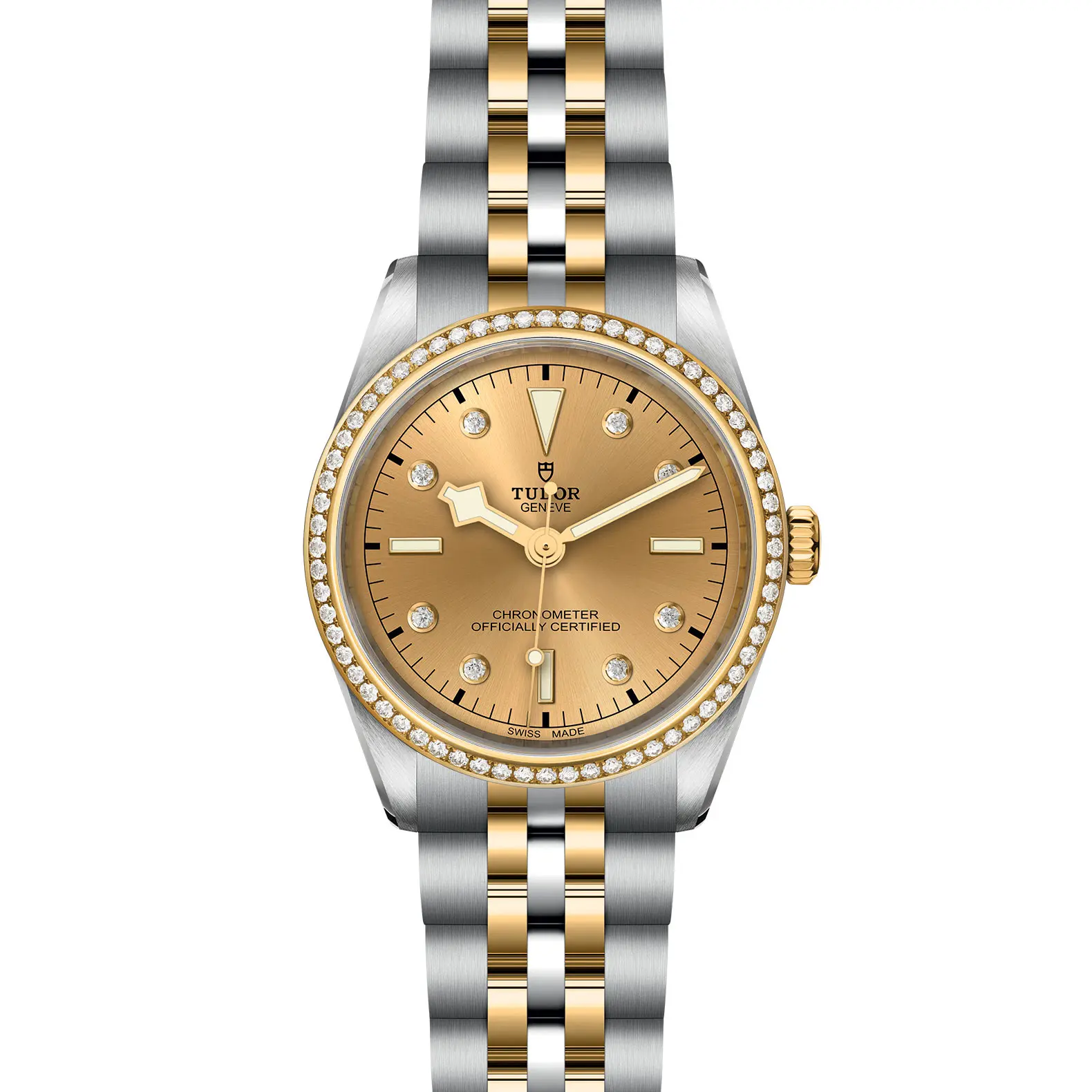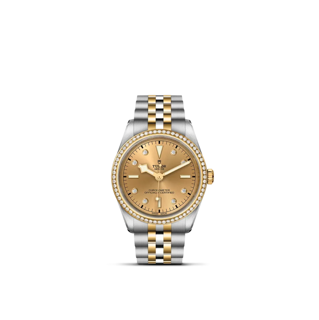 Prime maglie centrali in acciaio o in oro giallo massiccio. Maglie centrali restanti in acciaio o acciaio rivestito da uno strato di oro giallo di 0,2 mm. Chiusura pieghevole TUDOR “T‑fit” con fermaglio di sicurezza. Il logo sul fermaglio è realizzato in oro giallo massiccio