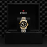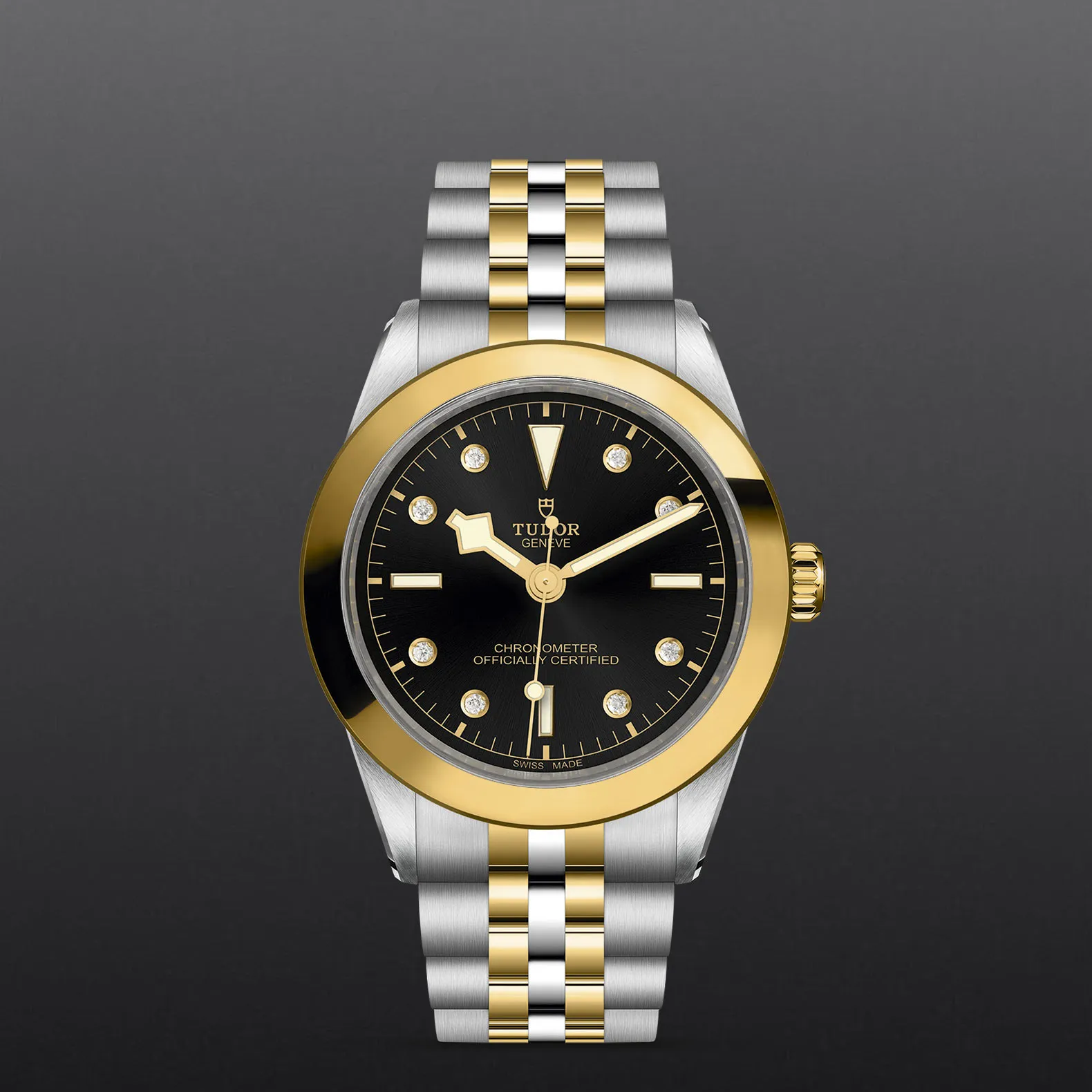 Prime maglie centrali in acciaio o in oro giallo massiccio. Maglie centrali restanti in acciaio o acciaio rivestito da uno strato di oro giallo di 0,2 mm. Chiusura pieghevole TUDOR “T‑fit” con fermaglio di sicurezza. Il logo sul fermaglio è realizzato in oro giallo massiccio